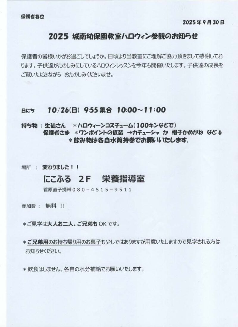 | 10/27-10/30 | ハロウィンレッスン | ||
