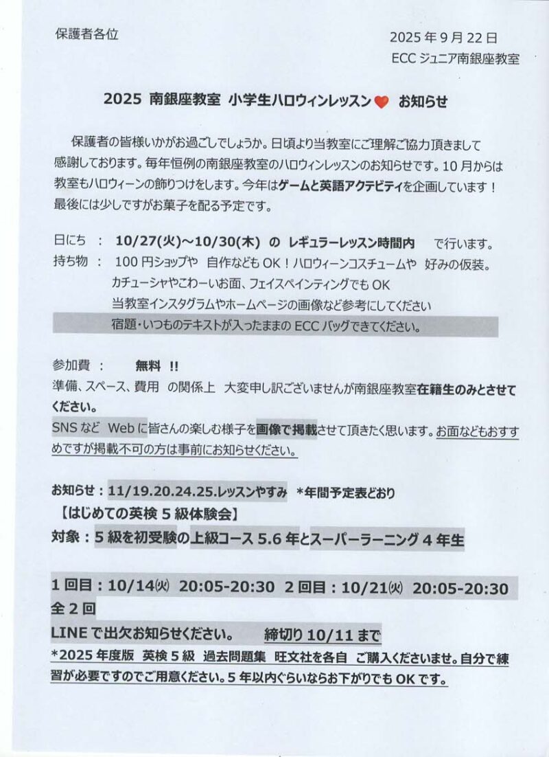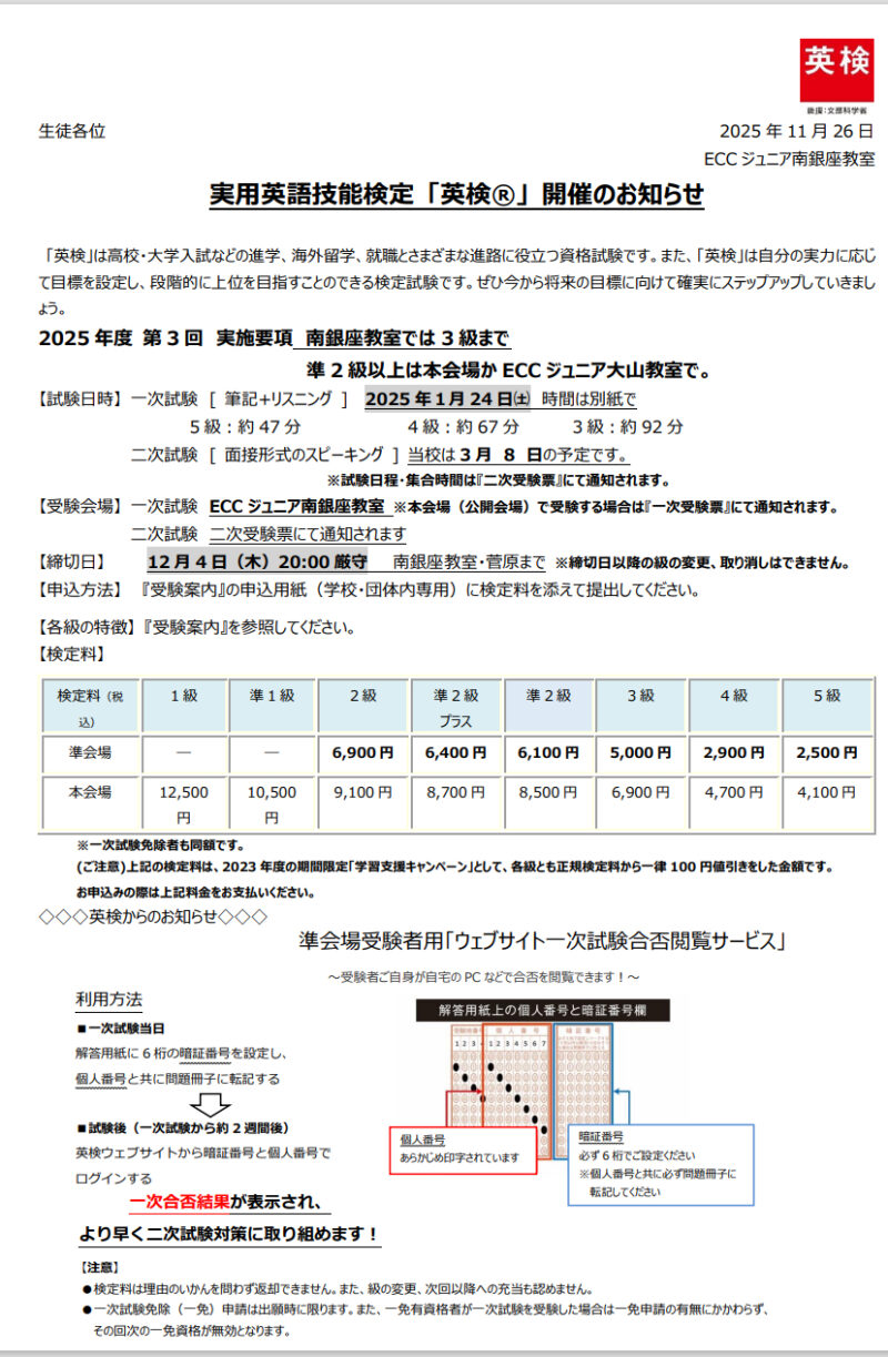 | 今のところ1/24㈯の予定 | 英検® ECCジュニア 南銀座準会場 | ||