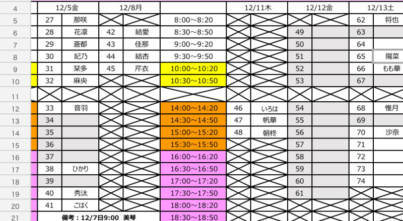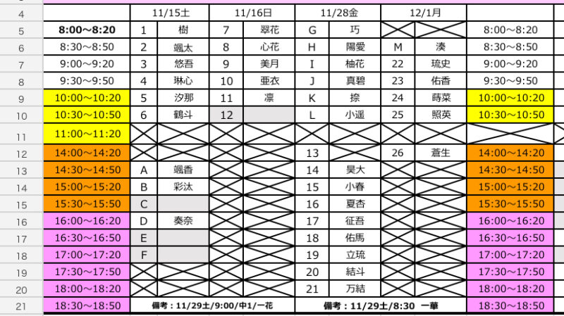 皆様、ご多忙のことと思いますがこちらの時間割で調整のほどよろしくお願い申し上げます。