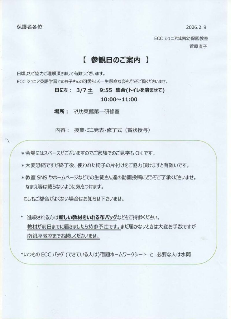 *日にちが変わりました。以前にお知らせしております。プリントは2/17以降に配ります。
