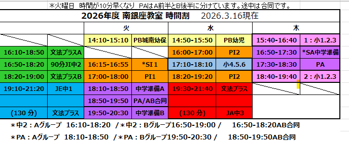 | 新中1-A | ×満席 | 月 | 16:10-18:20(130) | ABの中で時間調整可能 |